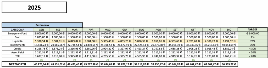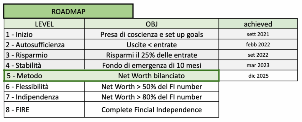 Per questo motivo credo che segnerò sullo spreadsheet “dicembre 2025” come data di raggiungimento dello step n. 5 del mio percorso finanziario: il Metodo. La nota che mi ero lasciato per aiutarmi a capire quando sarei arrivato a questo step era proprio “Net Worth bilanciato”, quindi credo sia corretto anche se 3,5k sono liquidi e non dovrebbero.