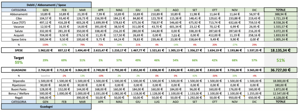 Oltre alle spese, per fortuna, sono cresciuti anche i guadagni annuali, passando da € 28.252 a € 36.727. Solo grazie a questo il Saving Rate è riuscito a rimanere intorno al 50%, invece che crollare verso lo zero.